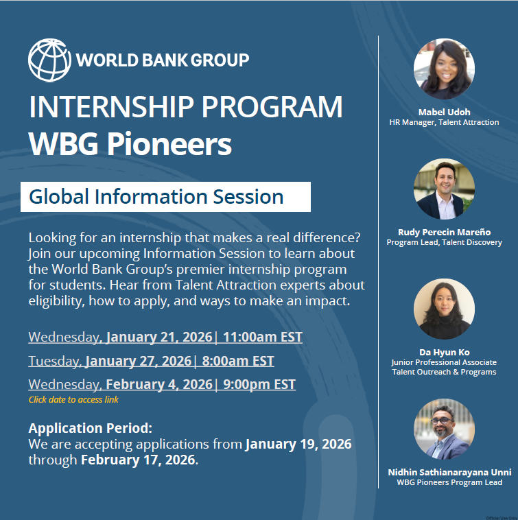 W imieniu Grupy Banku Światowego z przyjemnością informujemy o uruchomieniu nowego programu stażowego WBG Pioneers, który oferuje studentom i absolwentom możliwość zdobycia praktycznego doświadczenia przy projektach rozwojowych Banku Światowego w Waszyngtonie oraz w biurach BŚ na całym świecie.